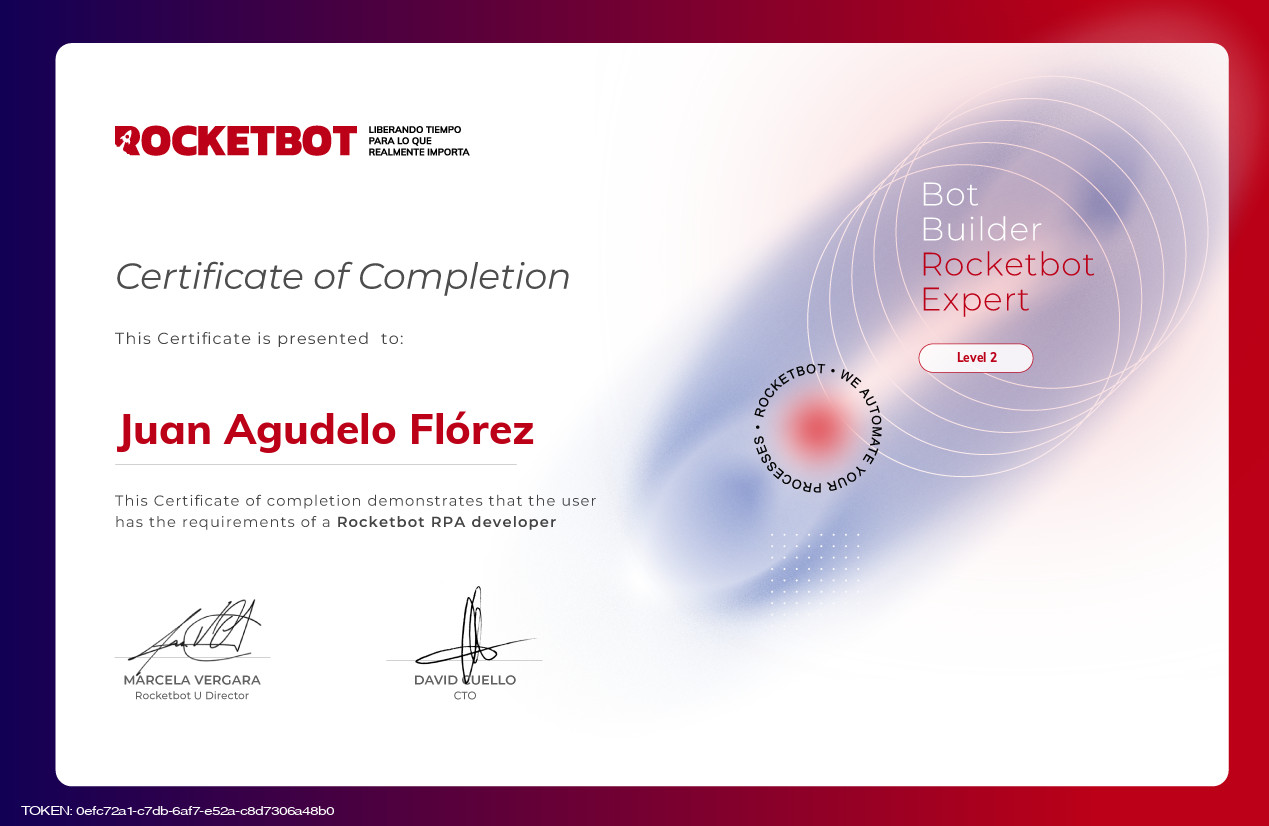This diploma certify a medium understanding of Rocketbot RPA concepts and their application to build Robots, on process automation. The owner of this diploma is able to build medium complexity Robots, combining Web, Email, Excel, Database, XML, FTP, and Legacy environments.