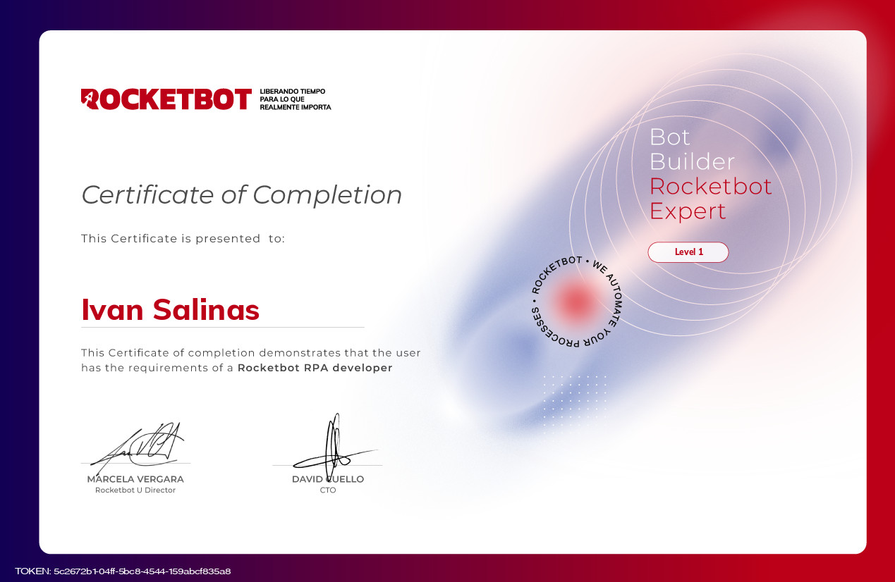 This diploma certify a basic understanding of Rocketbot RPA concepts and their application to build robots, on process automation. The owner of this diploma is able to build basic complexity robots, combining Web, Email and Excel environments.