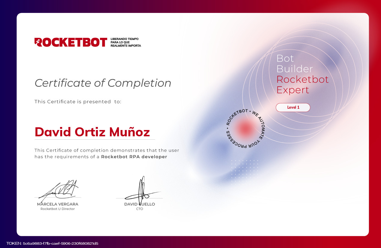 This diploma certify a basic understanding of Rocketbot RPA concepts and their application to build robots, on process automation. The owner of this diploma is able to build basic complexity robots, combining Web, Email and Excel environments.