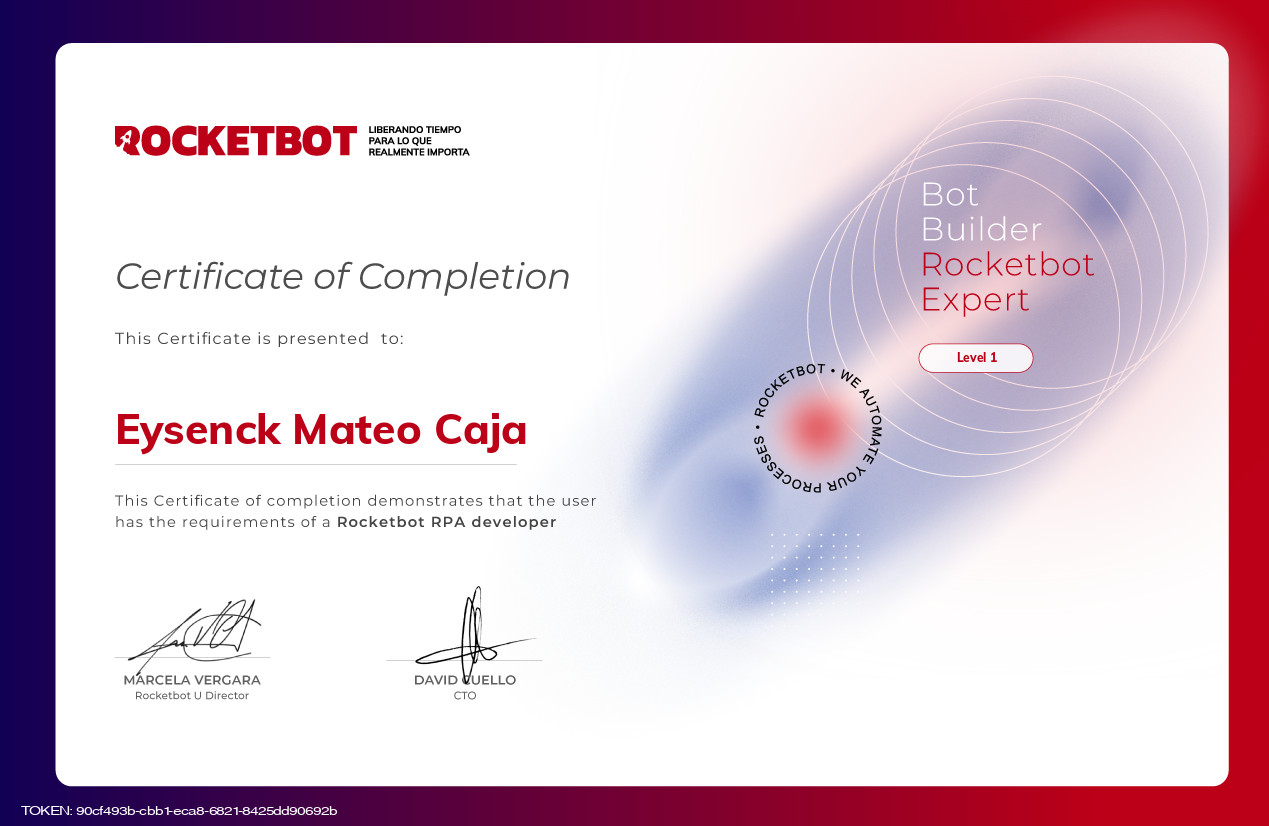This diploma certify a basic understanding of Rocketbot RPA concepts and their application to build robots, on process automation. The owner of this diploma is able to build basic complexity robots, combining Web, Email and Excel environments.